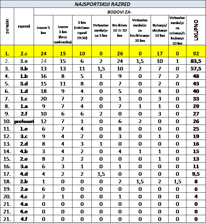 Nakon prvog virtualnog međurazrednog natjecanja u kojem je cilj bio pretrčati ili prohodati 5 km (ili kombinirati to dvoje) imamo i rezultate. Ukupno 213 sudionika prihvatilo je izazov (201 učenik i 12 profesora). Kilometri su se savladavali u okolici škole, oko Jaruna, Bundeka, na Medvednici, u Turopolju i na drugim mjestima gdje naši učenici (i profesori) žive. Svaki sudionik zaradio Opširnije