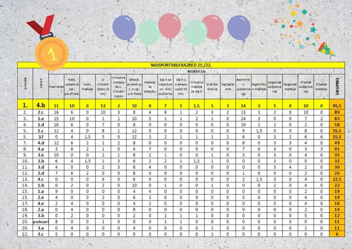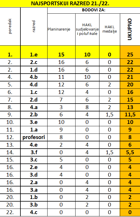 Završeno je natjecanje za najsportskiji razred. Kroz niz aktivnosti koroz cijelu godinu razredi su vrijedno prikupljali bodove, a posljednja šansa bila je na humanitarnoj utrci Run for MD. Već neko vrijeme na vrhu tablice je 2.f, a u ovoj utrci još su i povećali svoju prednost. Čitavo vrijeme 4.a je bio na korak od obrane lanjskog naslova, ali kolektiv kakav Opširnije
