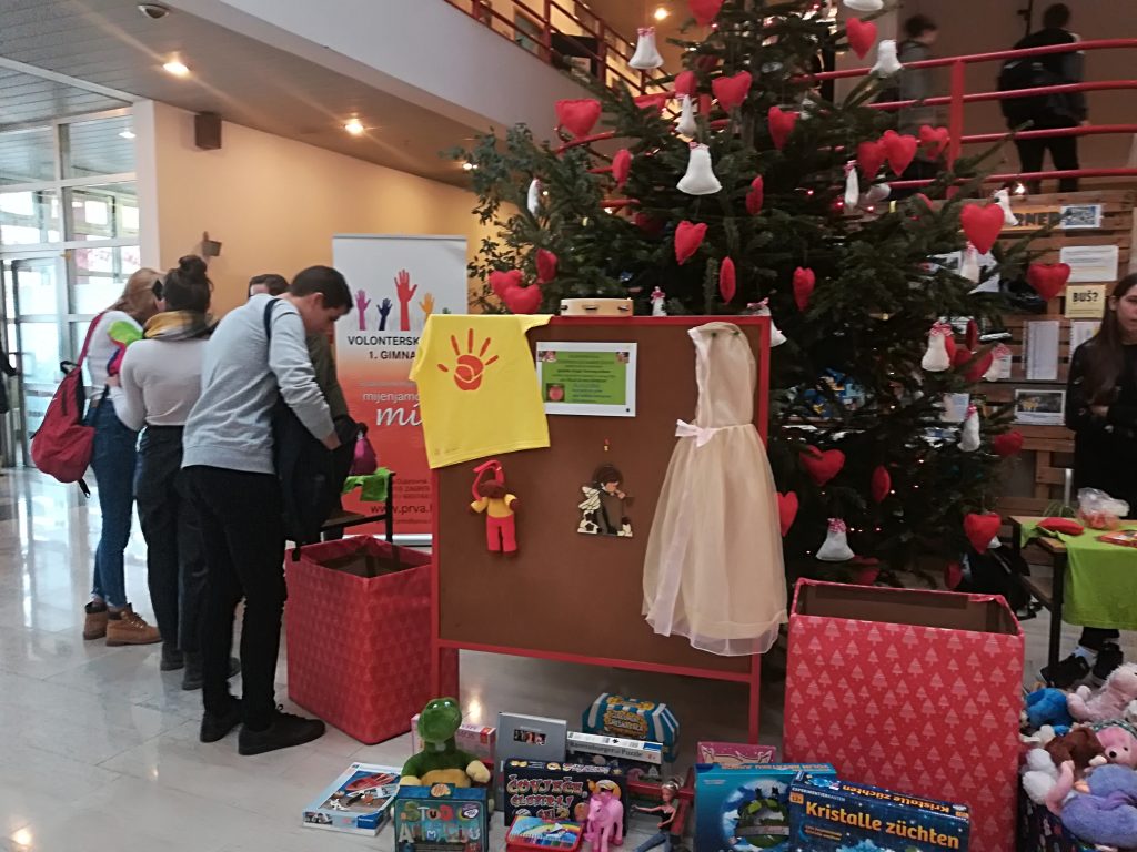 U nizu božićnih humanitarnih aktivnosti u organizaciji Volonterskog kluba Prve, akcija “100 želje za 100 osmijeha” provedena u suradnji s bivšim učenikom I.gimnazije, članom LEO KLUBA Tri kule Antoniom Spajićem, nadmašila je sva očekivanja. U samo dva dana, 12.-13. prosinca 2019., prikupljeno je preko 100 plišanih igračaka, preko 100 dječjih knjiga i školskog pribor te više od 75 igračaka za božićno darivanje djece siromašnijih obitelji Crvenog križa, a sudjelovali su svi, od učenika i volontera do profesora, ravnateljice i ostalih djelatnika škole. Hvala svima!!!