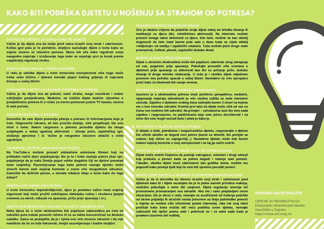 Djelatnici Odgojnog savjetovališta Centra za rehabilitaciju Edukacijsko rehabilitacijskog fakulteta izradili su informativni letak Kako biti podrška djetetu u nošenju sa strahom od potresa? kako bi se malo olakšali ovi dani te kako bi se pomoglo djeci a i nama odraslima.
