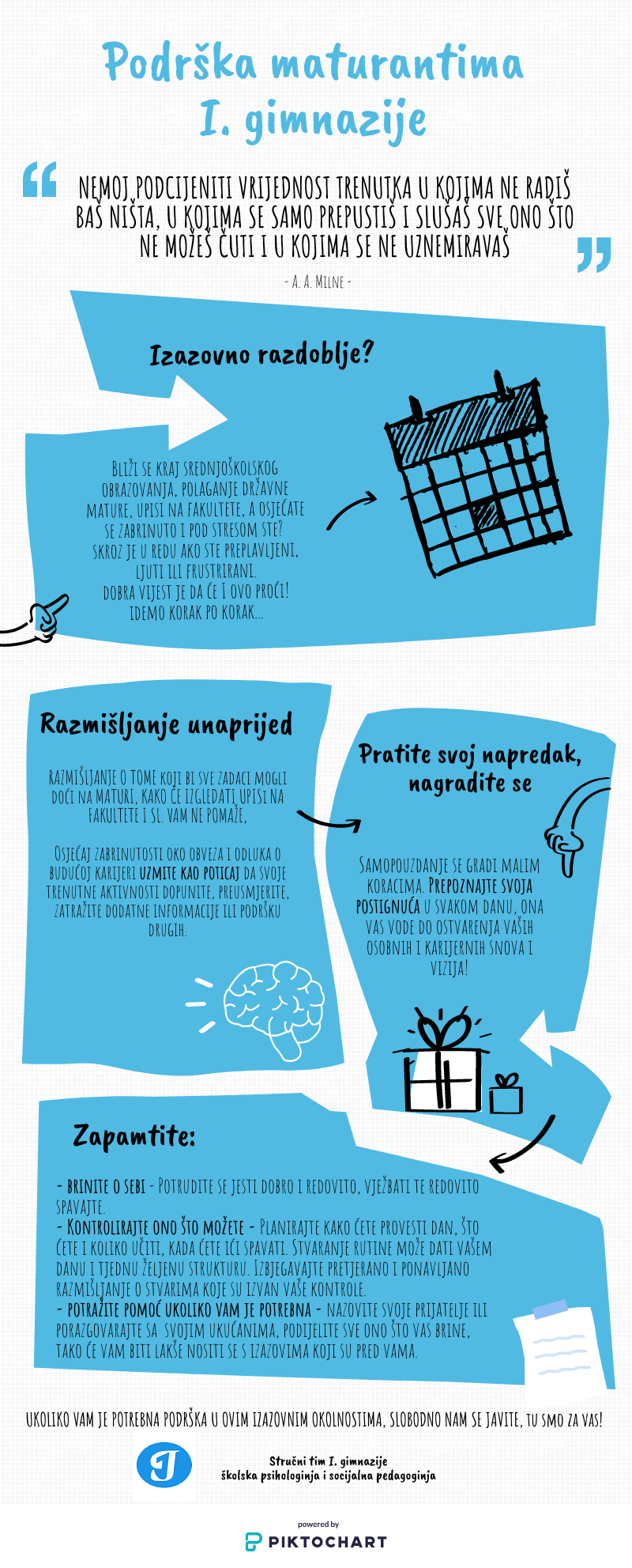 Članice stručnog tima škole, školska psihologinja i socijalna pedagoginja izradile su infografiku za maturante pružajući im podršku u izazovnom periodu koji je pred njima. Infografika se može preuzeti ovdje.
