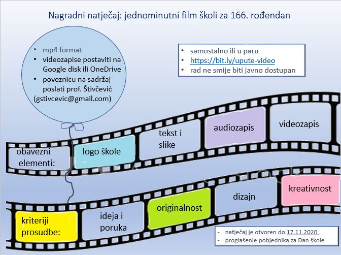Izradite jednominutni film i spremite ga u formatu .mp4. Svoj rad postavite na Google Disk ili One drive, a poveznicu pošaljite na adresu gstivcevic@gmail.com. Pripremili smo i kratke upute za stvaranje videozapisa za sve one koji do sada nisu stvarali filmiće.