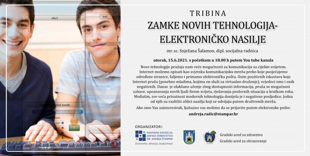 U okviru Školskog preventivnog programa, pozivamo roditelje učenika na tribinu Nastavnog zavoda za javno zdravstvo dr. A. Štampar  “Zamke novih tehnologija- elektroničko nasilje”  u utorak 15. lipnja 2021. u 18 sati putem You tube kanala.