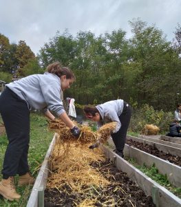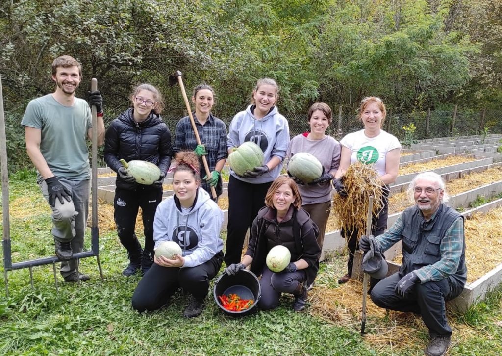 U četvrtak 21.10. 2021. volonterke I. gimnazije Antonela (4.d), Lana Š. (1.c) i Dora  (3.b) u pratnji šk. psihologinje Vlaste Lukačević, prof. provele su radni dan volontirajući na  recikliranom imanju Zelene mreže aktivističkih grupa (ZMAG).  Nastavak je to suradnje s Volonterskim centrom Zagreb kada je prva grupa volontera Prve vrtlarenjem na  prvom recikliranom imanju u Vukomeriću sudjelovala u manifestaciji “Hrvatska volontira”. Branje jesenskih povrtnica poput bundeva i ljutih papričica, rahljenje tla posebnim vilama, odvajanje korova te gnojidba bili su poslovi u kojima su se neki u grupi volontera od 15 – 67 godina po prvi puta okušali.  Uz to, druženje su upotpunili ljubimac imanja sivi mačak, zelena bogomoljka, šumska žaba,  vrtni skakavci i bubamare.  Bila je to prilika za posjetiti društvenu banku sjemena autohtonih sorti  na imanju i boraviti u recikliranoj drvenoj turopoljskoj kući iz 19. stoljeća. Više nego vrijedno dolaska i uloženog volonterskog truda. A škola je dobila svoju bundevu za Halloween!