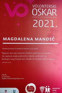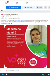 U susret obilježavanju 5.12. Međunarodnog dana volonterstva, Volonterski klub I. gimnazije sudjelovao je u petak 3. 12.2021. na svečanoj dodjeli nagrade Volonterskog centra Zagreb “Volonterski Oskar 2021”.  Naša volonterka Magdalena Mandić iz 4.b bila je jedina nominirana kandidatkinja iz područja školskog volontiranja i nagrađena je posebnim priznanjem Volonterskog centra Zagreb za volonterski doprinos u 2021.