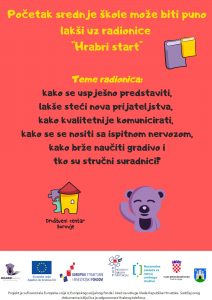 U okviru Školskih preventivnih strategija, I. gimnazija pružila je mogućnost sudjelovanja učenika i učenica prvih razreda u preventivnom programu Društvenog centra Borovje “Hrabri start”. Radi se o ciklusu od 7 tema namijenjenih upravo učenicima/cama prvih razreda srednje škole s ciljem jačanja njihovih komunikacijskih i socijalnih vještina te olakšavanja prijelaza iz osnovne u srednju školu. Sudjelovalo je ukupno 17 učenica prvih razreda tri zagrebačke gimnazije i dvije strukovne škole. Kroz četiri subotnja online susreta u razdoblju od 9.listopada do 6. studenoga 2021. psihologinje Društvenog centra Borovje obradile su s mladima sljedeće teme: