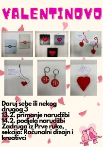 Zadruga naše škole Iz Prve ruke (sekcije Računalni dizajn i Kreativci) pripremaju za vas raznovrsne poklone kojima možete darovati sebe ili nekog drugog. Navratite na naš štand u ponedjeljak 13. i utorak  14. veljače pod velikim odmorom. Možete odabrati nekoliko darova, a mi ćemo ih umjesto vas spakirati i predati. Pogledajte kataloge s prigodnim radovima.