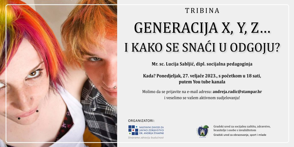 Tribina za roditelje i stručne suradnike u školama i drugim odgojno-obrazovnim ustanovama: „Generacija X, Y, Z… i kako se snaći u odgoju?“ održat će se u ponedjeljak, 27. veljače 2023. godine, s početkom u 18 sati putem Youtube kanala. Vodit će je mr. sc. Lucija Sabljić, dipl. socijalna pedagoginja iz Službe za mentalno zdravlje i prevenciju ovisnosti NZJZ „Dr. Andrija Štampar“