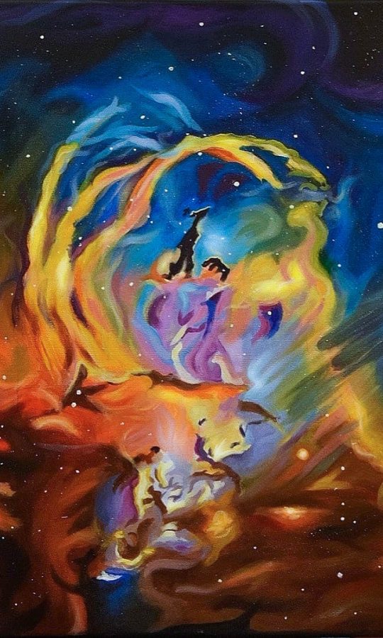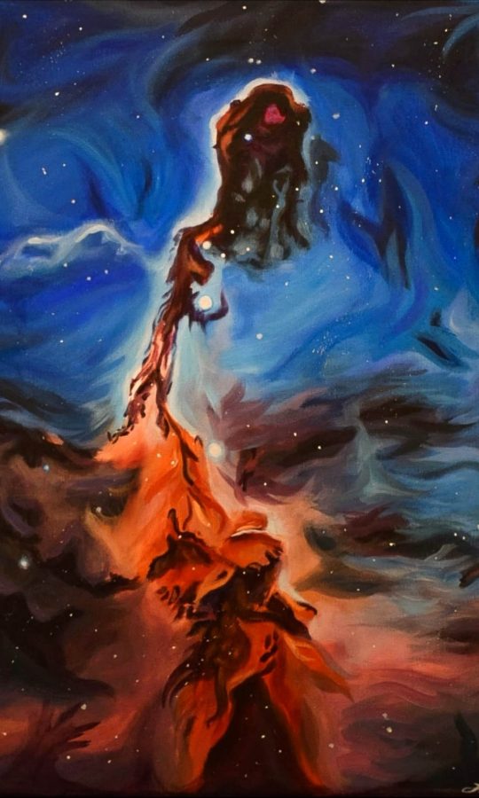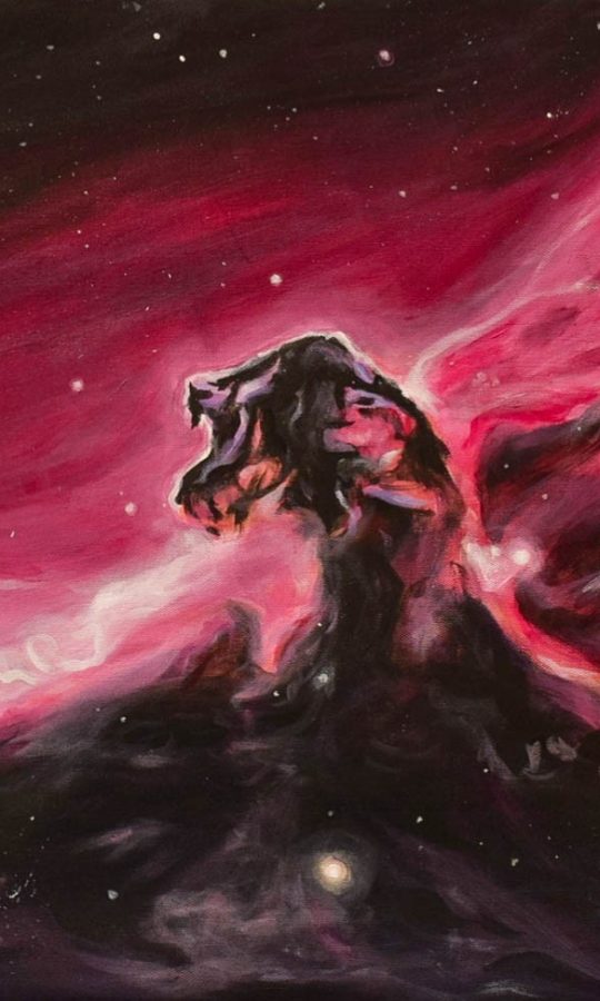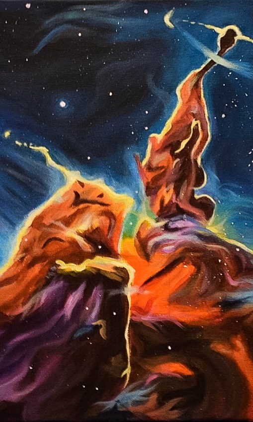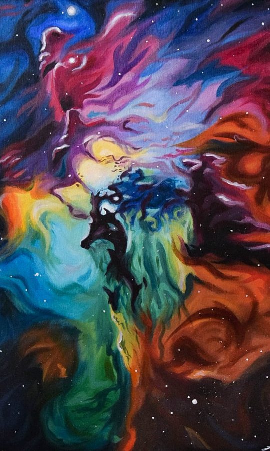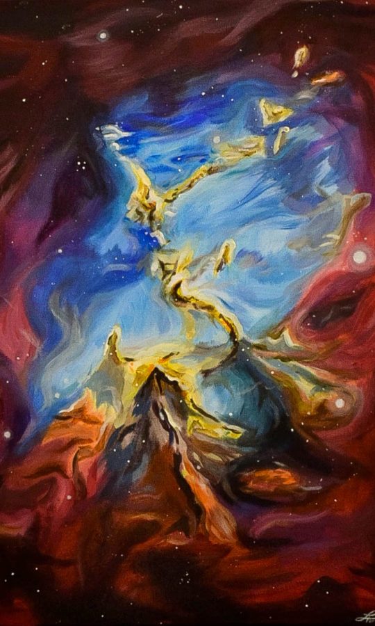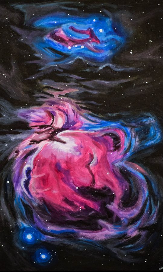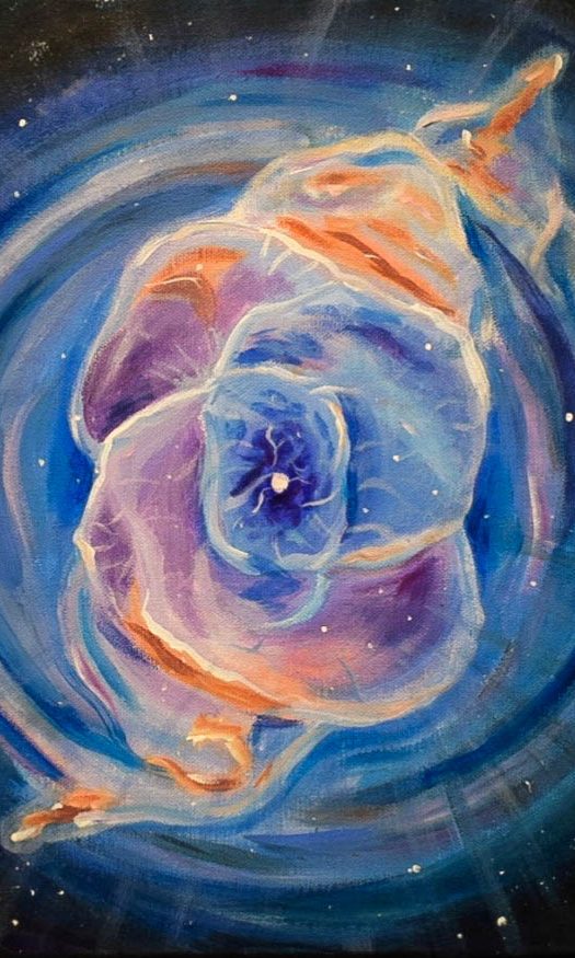 Inspirirana svojim višegodišnjim sudjelovanjem na edukacijskim programima i ljetnim kampovima u Znanstveno edukacijskom centru Višnjan, razvila sam ljubav prema astronomiji, a naknadno i astrofotografiji koju sam odlučila spojiti sa svojom strašću, slikarstvom. Izložba „Nebuloze“ serija je u isto vrijeme realističnih i apstraktnih prikaza maglica (nebula), međuzvjezdanih oblaka plinova i prašine promjera od više stotina do nekoliko tisuća svjetlosnih godina, sazdanih većinom od vodika i helija, ali i ugljika, dušika, magnezija, kalija, kalcija, željeza; elemenata koji grade zvijezde, zvjezdane sustave, planete, pa naposljetku i živa bića, uključujući i nas same. To su mjesta na kojima najmanja prostorna interferencija izaziva kovitlanje vrtloga guste materije koja se sabija do točke nastanka zvijezda, iz kojih nadalje proizlazi bezbroj kompleksnih svjetova. Djela iz ove zbirke nastala su po uzoru na astrofotografije poznatih svjetskih teleskopa poput Hubblea, teleskopa iz Zvjezdarnice Višnjan, ali i brojnih amaterskih astrofotografa, stoga bi se moglo reći da je zbirka tih, naizgled izuzetno apstraktnih, oblika i boja zapravo do neke mjere realističan prikaz kozmičkog pejzaža. Prateći prirodnu konfiguraciju tih objekata, svaka pojedina slika bilježi ritam pokreta, fluidnost poteza, neograničenost izražavanja te određenu vrstu slobode zarobljene u okovima realizma, predstavljajući pritom spoj nespojivog, ovozemaljskog i onozemaljskog, kozmičkog vanjskog i izrazito unutarnjeg i psihološkog. S obzirom na činjenicu da ne možemo vizualno mapirati ljudske emocije, ovi vrtlozi zvjezdane prašine predstavljaju najbliži prikaz čovjekova unutarnjeg monologa, osjećaja poput bijesa i melankolije, uzbuđenja i euforije. Ova će izložba možda pomoći promatraču da pronađe portret svoje unutrašnjosti iz dalekih kutaka svemira, upravo u malom kutku skromnog opusa jedne gimnazijalke.
