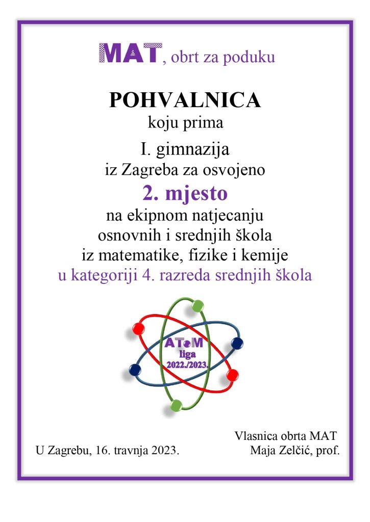 Naš učenik Luka Kalac (4.b) u prosincu 2022. godine sudjelovao je na 20. Turniru mladih fizičara. Luka se pripremao u praktikumu metodike fizike na Fizičkom odsjeku PMF-a te rješavanjem problema rotirajuće sfere u magnetskom polju ostvario 5. mjesto na Hrvatskom turniru mladih fizičara. Na takav način Luka se plasirao u hrvatsku reprezentaciju za Međunarodni turnir mladih fizičara 2023., koji će se održati u Pakistanu.