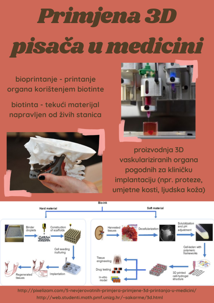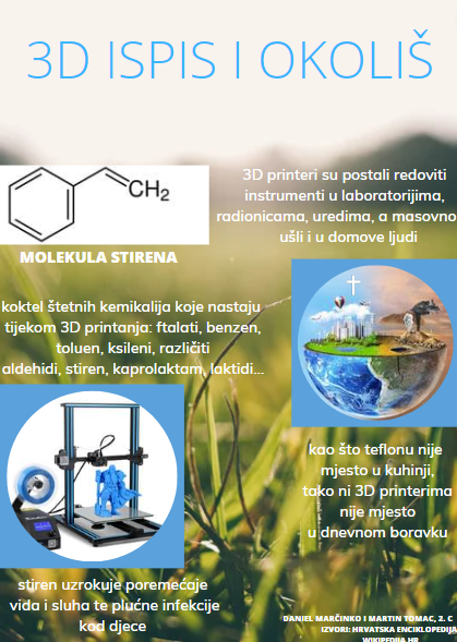 3D ispis primjenjuje se u raznim područjima kao što su medicina, građevina, autoindustrija, sport, prehrana… Učenici su istražili i utjecaj 3D ispisa na okoliš. Još uvijek tehnologija 3D printanja za printanje raznih proizvoda koristi polimerne materijale odnosno plastiku (filament). Međutim, 3D printeri mogu kao materijal koristiti beton ili hranu. Ova tehnologija se ubrzano razvija i tko zna gdje će još pronaći primjenu.