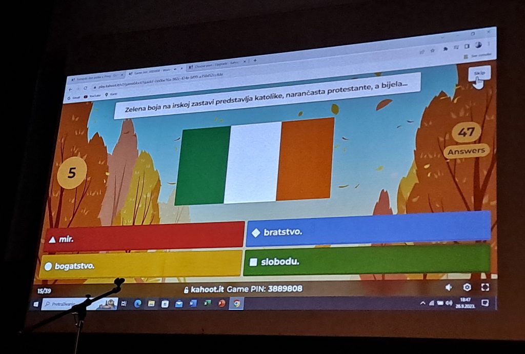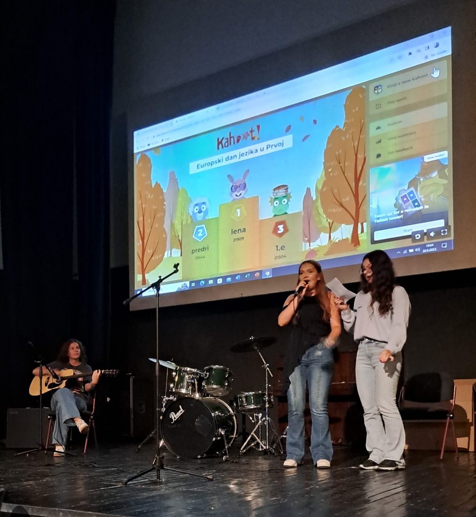 Osim odabira poznatih svjetskih hitova na engleskom, njemačkom, španjolskom, talijanskom i francuskom jeziku te nezaobilaznog Gaudeamusa na latinskom koji su se mogli čuti tijekom odmora, nastavnici stranih jezika (prof. Opatić, prof. Romac, prof. Morduš, prof. Polanček, prof. Joler, prof. Math, prof. Rebrović, prof. Bekić, prof. Čubranić i prof. Banožić) osmislili su Kahoot kviz za učenike naše škole, a prof. Vladušić uvježbala muzičare. U kinodvorani je bilo živo i zabavno, uz pjesmu za kraj: Sarà perché ti amo koju su izvele Chiara Agreš i Lana Šurina iz 3.c uz pratnju Lorene Gabrić iz 3.d na gitari te Katarine Pranjić iz 2.b na klaviru.