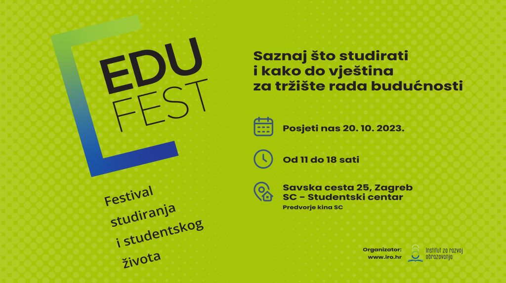 U petak 20.10.2023., u organizaciji Instituta za razvoj obrazovanja, održava se EDUFEST – Festival studiranja i studenskog života u Studenskom centru od 11- 18 sati. EDUFEST predstavlja najveće obrazovno događanje u regiji. Događaj može biti zanimljiv maturantima/icama i učenicima/icama ostalih razreda zainteresiranim za studiranje i mogućnosti stipendiranja studija u Hrvatskoj i inozemstvu.