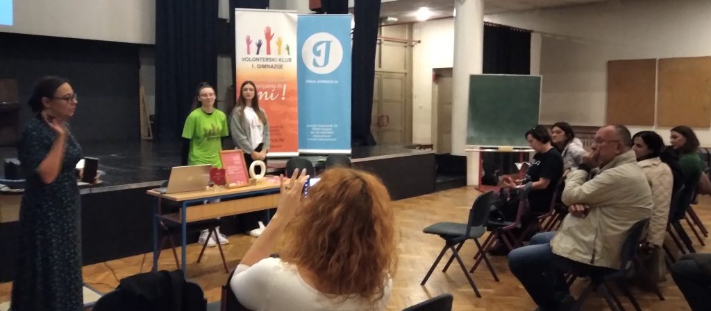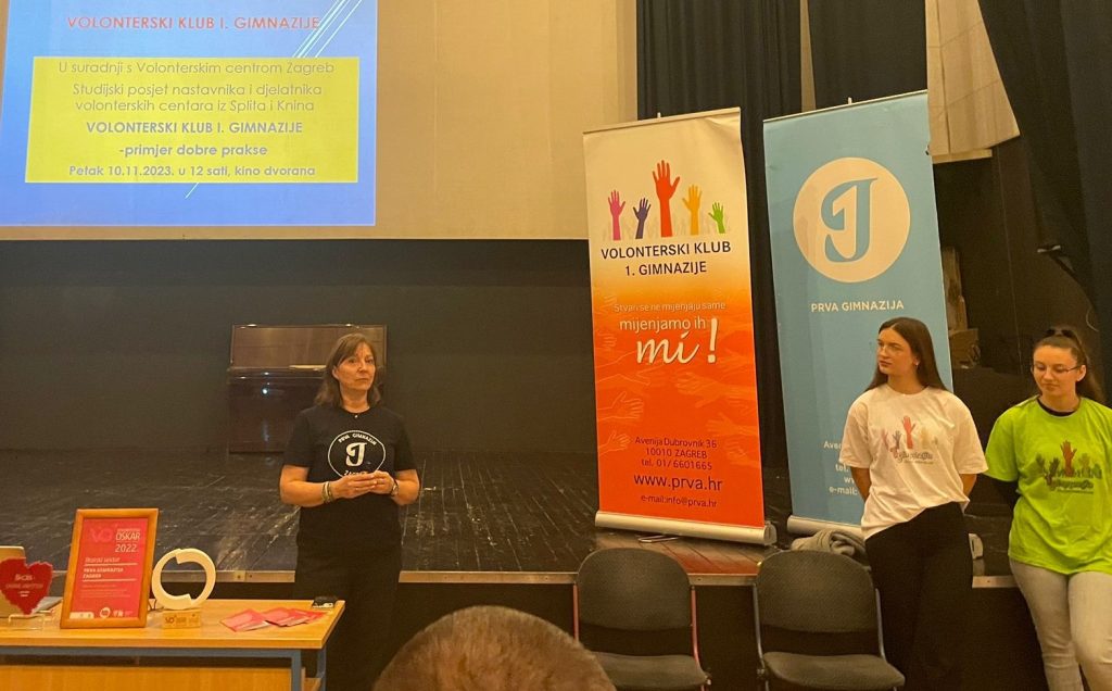Na poziv Volonterskog centra Zagreb, u petak 10.11. 2023. organiziran je studijski posjet nastavnika srednjih škola i djelatnika volonterskih centara iz Splita i Knina Volonterskom klubu I. gimnazije kao primjeru dobre prakse školskog volontiranja. Uz uvodni pozdrav ravnateljice Dunje Marušić Brezetić, prof. školska psihologinja i koordinatorica Volonterskog kluba Vlasta Lukačević, prof. te zamjenica voditeljice kluba Elena Jukić iz 3.c i volonterka Nives Mesić iz 2.c upoznale su goste/će s aktivnostima i postignućima našeg Volonterskog kluba u zadnjih 16 godina postojanja.