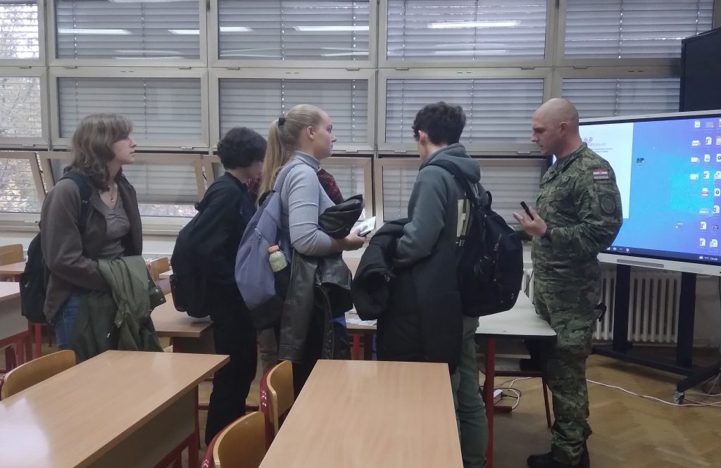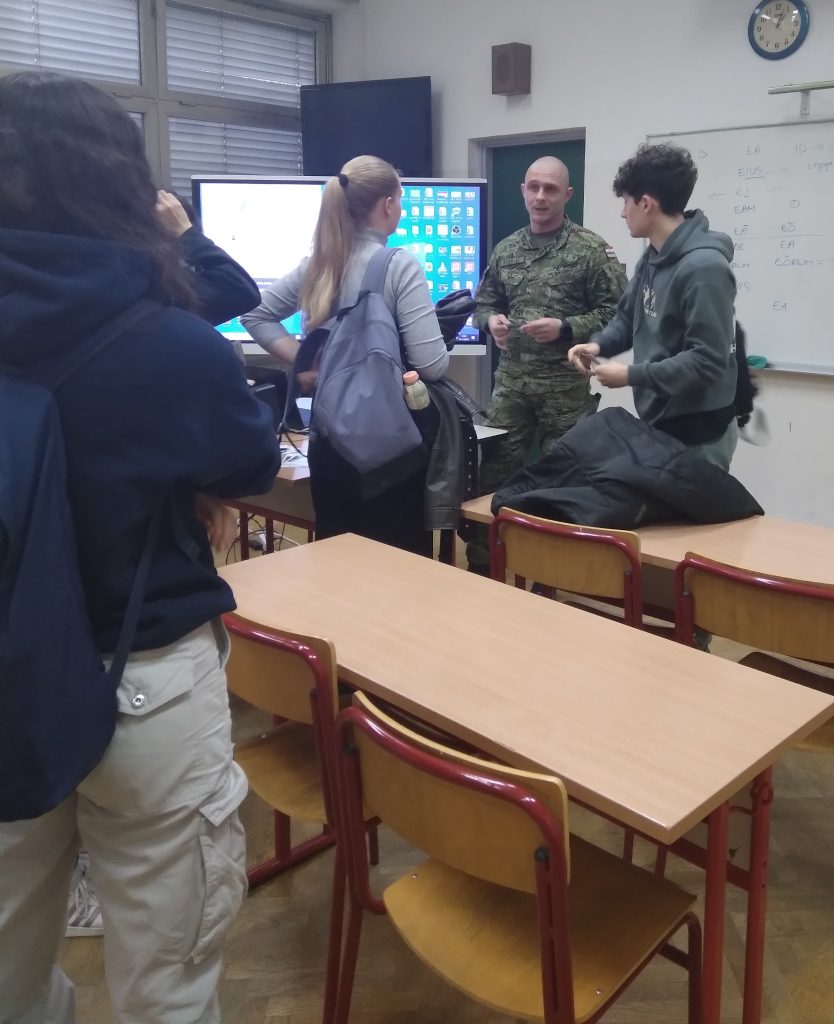 U okviru Školskog programa profesionalnog informiranja i usmjeravanja, u utorak 14.11. 2023., za zainteresirane maturante/ice i učenike/ice ostalih razreda, održana je prezentacija o studijskim programima Hrvatskog vojnog učilišta: Vojno inžinjerstvo, Vojno vođenje i upravljanje, Aeronautika – modul vojni pilot i Vojno pomorstvo. Učenici i učenice imali su priliku čuti osnovne informacije o uvjetima upisa, studijskim programima i specifičnostima studiranja i života na Hrvatskom vojnom učilištu.