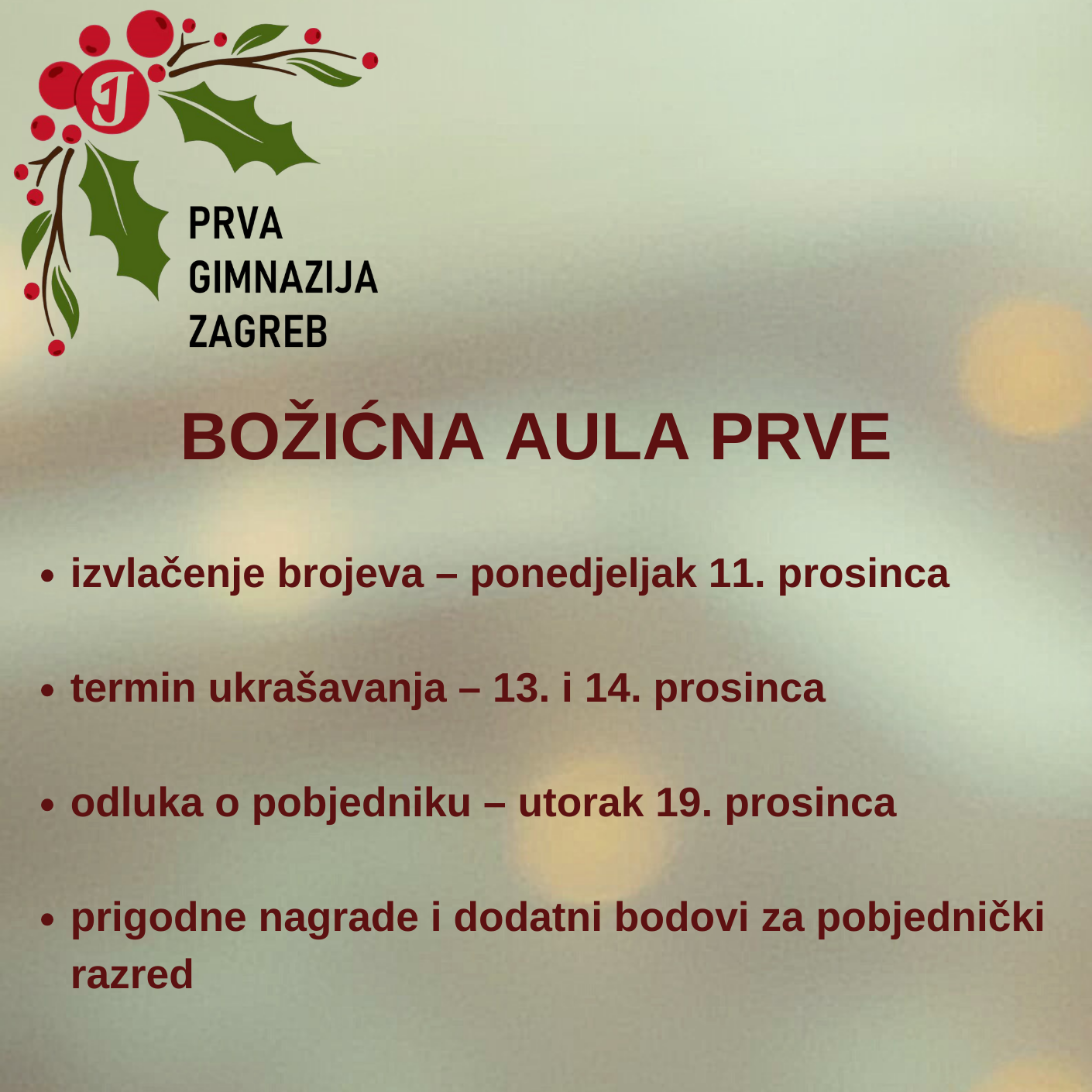 „Božićna aula Prve“. Svaki razred dobit će prostor za ukrašavanje (izvlačenje brojeva/prostora bit će u