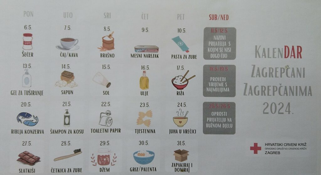 Tijekom svibnja, od 6.-31.5.2024. sudjelujemo u humanitarnoj akciji Hrvatskog Crvenog križa „Kalendar Zagrepčani – Zagrepčanima 2024.” – akcija prikupljanja namirnica i potrepština za Socijalni dućan Hrvatskog Crvenog križa