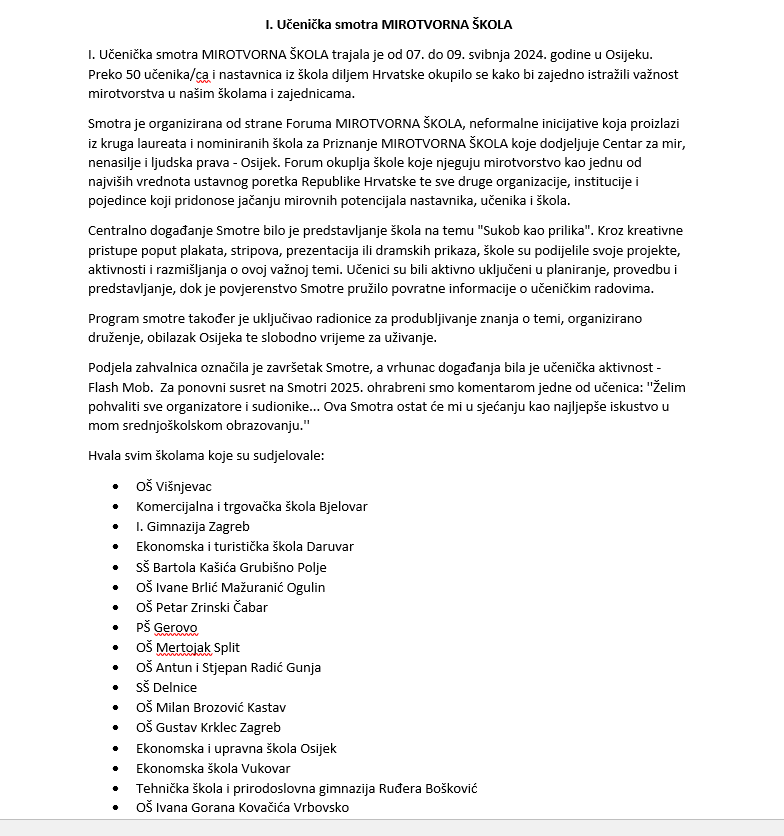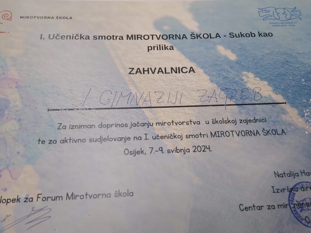 Na Smotri je, uz edukaciju o mirotvorstvu, prezentiranje ostalih 20- tak osnovnih i srednjih škola koje su laureati priznanja “Mirotvorna škola”, I. gimnazija primljena u Forum mirotvornih škola Hrvatske!