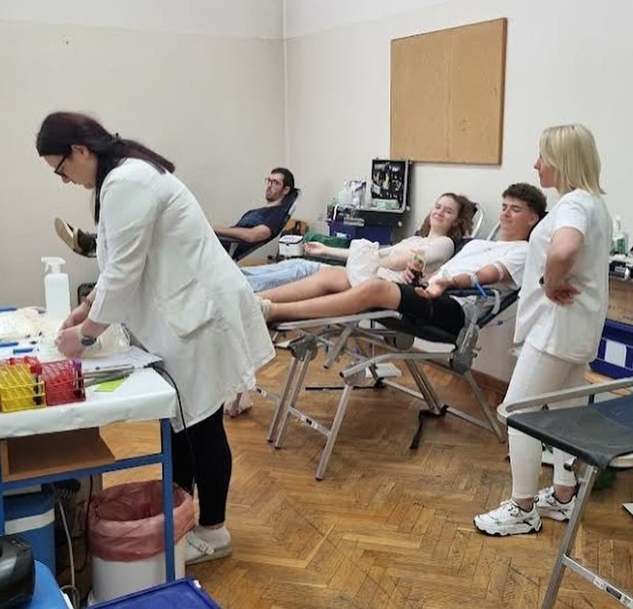 U ponedjeljak 29. 4. 2024. naša škola je udomila Transfuzijski zavod i volontere Crvenog križa. Grupa od 35 učenika i učenica I. gimnazije, nesebično je, po prvi puta darivala krv. Ovom plemenitom i solidarnom činu priključilo se i četvero nastavnika/ica i članice stručnog tima škole.