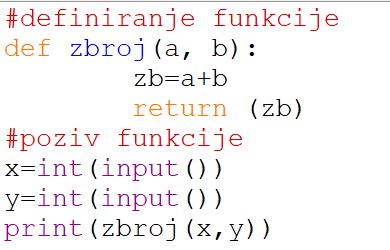 -brojevi koje zbrajamo (x i y) unose se u glavnom dijelu programa, rezultat funkcije (zb) vraća se u glavni program naredbom return