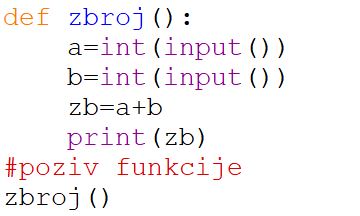 I dalje možemo primijetiti da se pojedini dijelovi koda ponavljaju pa ćemo na ovom mjestu naučiti kako napisati funkciju koju ćemo pozvati nekoliko puta. Ovdje ćemo kao primjer napisati funkciju koja zbraja dva broja.