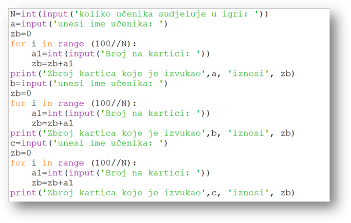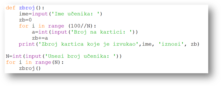 Poboljšajmo programski kod tako da ga možemo koristiti neovisno o broju učenika koji sudjeluju u igri. Broj kartica koje izvlači pojedini učenik izračunat ćemo na način da ćemo broj 100 cjelobrojno podijeliti s brojem učenika (100//n).