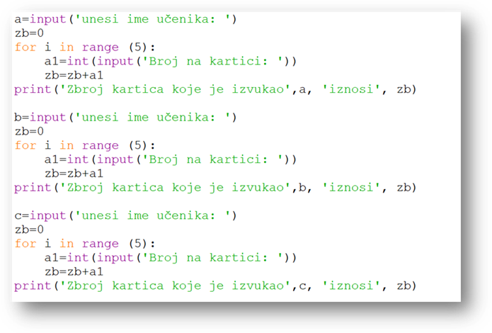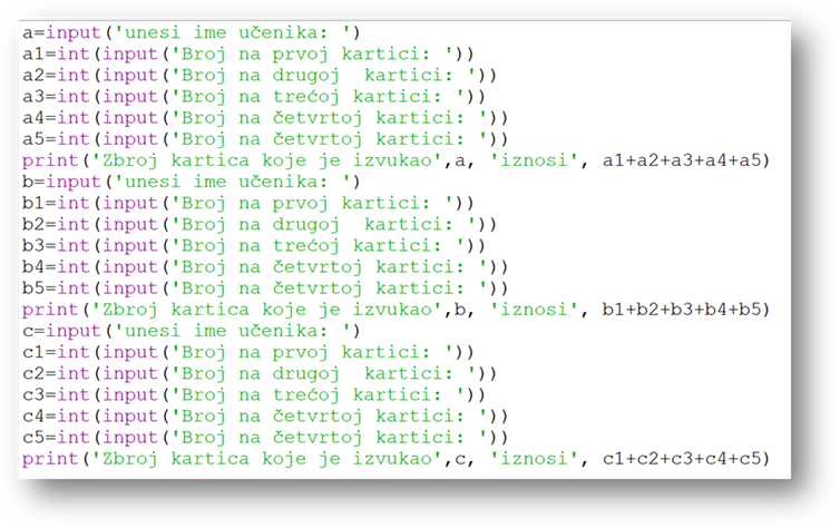 Slika 1 Dio programskog koda – zbroj brojeva na karticama za tri učenika