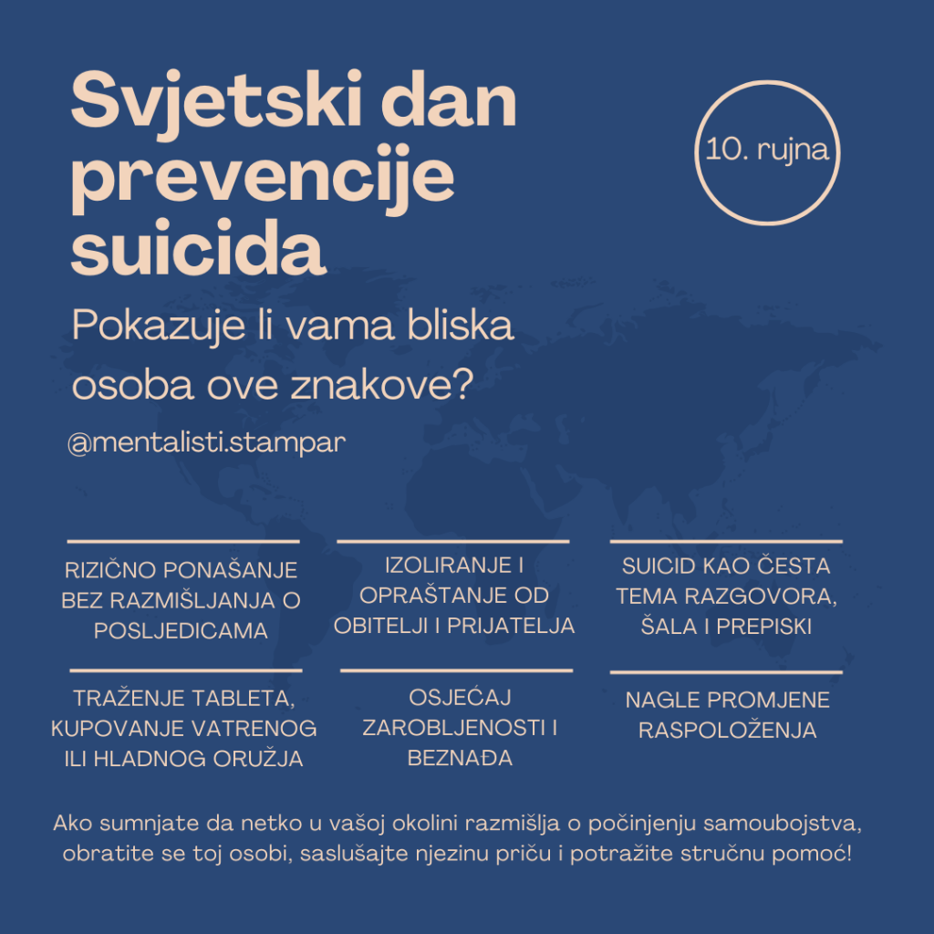 Svjetski dan prevencije suicida obilježava se od 2003. svake godine 10. rujna na poticaj Međunarodnog udruženja za prevenciju samoubojstava (IASP) u suradnji sa Svjetskom zdravstvenom organizacijom (WHO).