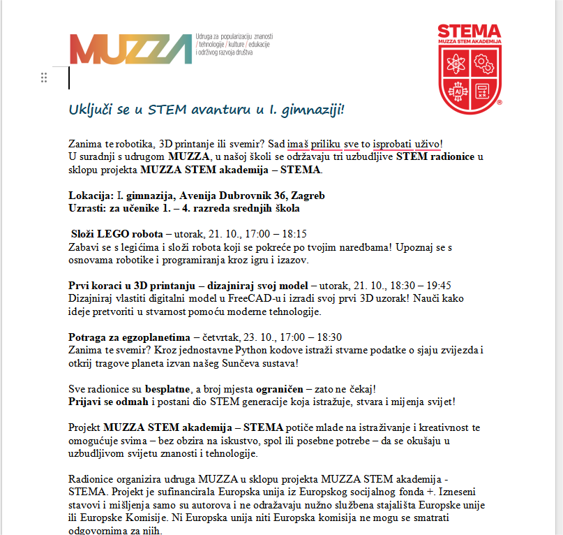 U sklopu aktivnosti poticanja darovitosti, suradnji s Udrugom za promicanje znanosti MUZZA , u I. gimnaziji planira se provedba tri radionice u sklopu projekta MUZZA STEMA – STEM Akademija. Uz vodstvo mentora s prestižnih fakulteta STEM područja, za grupe do 10 zainteresiranih učenika/ica organizirat će se u utorak 21.10.2025. radionice na temu “Složi LEGO robota” i “Prvi koraci u 3D printanju – dizajniraj svoj model” te radionica “Potraga za egzoplanetima” u četvrtak 23.10.2025.