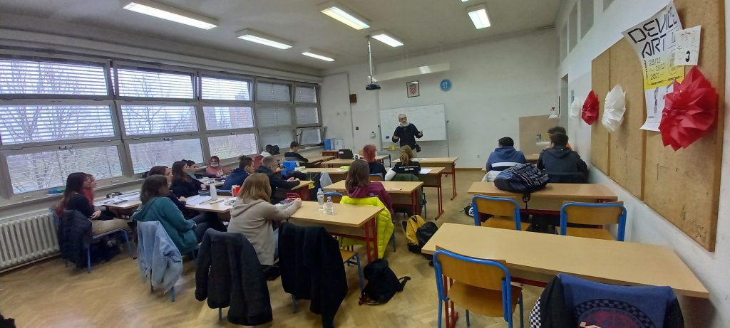 U suradnji s Muzejom Mimara 28.4. 2022. u auli škole održano je otvorenje izložbe. Postavljeno je 9 reprodukcija slika iz zbirki slikarstva Muzeja Mimara, a autor te ujedno i kustos izložbe, naš bivši učenik, Krešimir Juraga, pružio nam je pogled u skrivene strane umjetnina te načine rada povjesničara umjetnosti i muzealaca. Otvorenje izložbe dodatno je obogaćeno glazbenom izvedbom naših pjevačica Opširnije