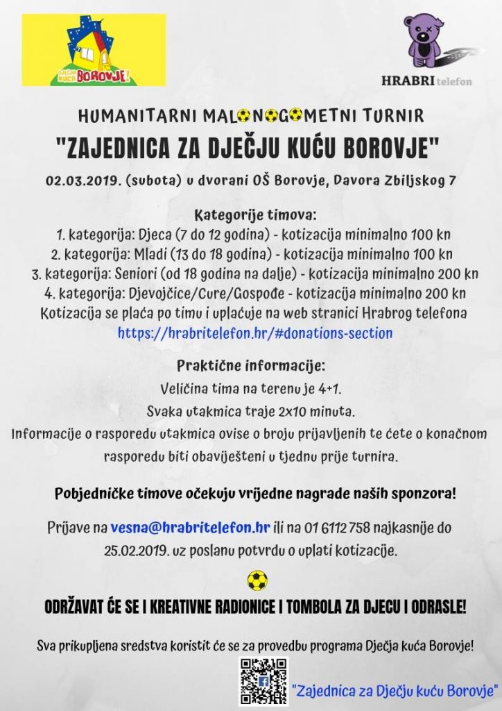 Dragi učenici, nastavnici i roditelji, pozivamo vas da se prijavite na humanitarni malonogometni turnir “Zajednica za Dječju kuću Borovje” koji će se održati u subotu 2. ožujka 2019. godine u dvorani Osnovne škole Borovje. Dječja kuća Borovje je program Hrabrog telefona u sklopu kojeg se za djecu u dobi od 4 do 18 godina održavaju preventivne radionice, individualni susreti pomoći pri Opširnije
