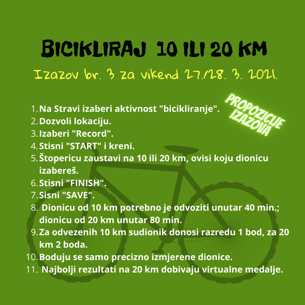 PROPOZICIJE Izazov treba odraditi u subotu ili nedjelju (6./7. 2. 2021.); U natjecanje ulazi samo jedan rezultat svakog učenika; Vrijeme savladavanja dionice mjeri se Strava aplikacijom; Nakon što se aplikacija pokrene dionicu treba odraditi bez zaustavljanja vremena; Vrijeme treba zaustaviti kada prijeđena udaljenost bude punih 5 km (može par metara više, ali nikako manje); Nakon zaustavljanja vremena “moving time” i Opširnije