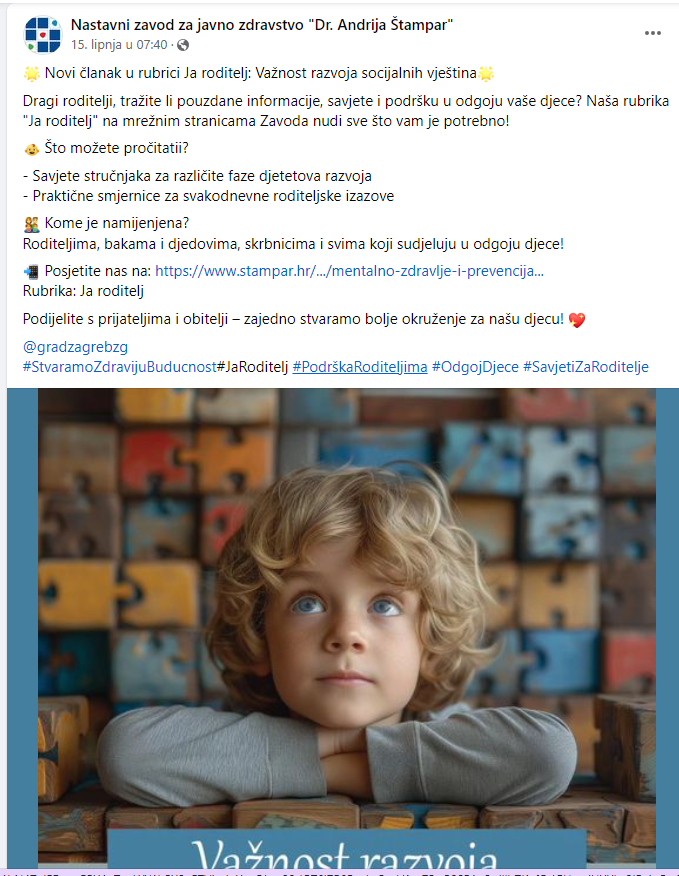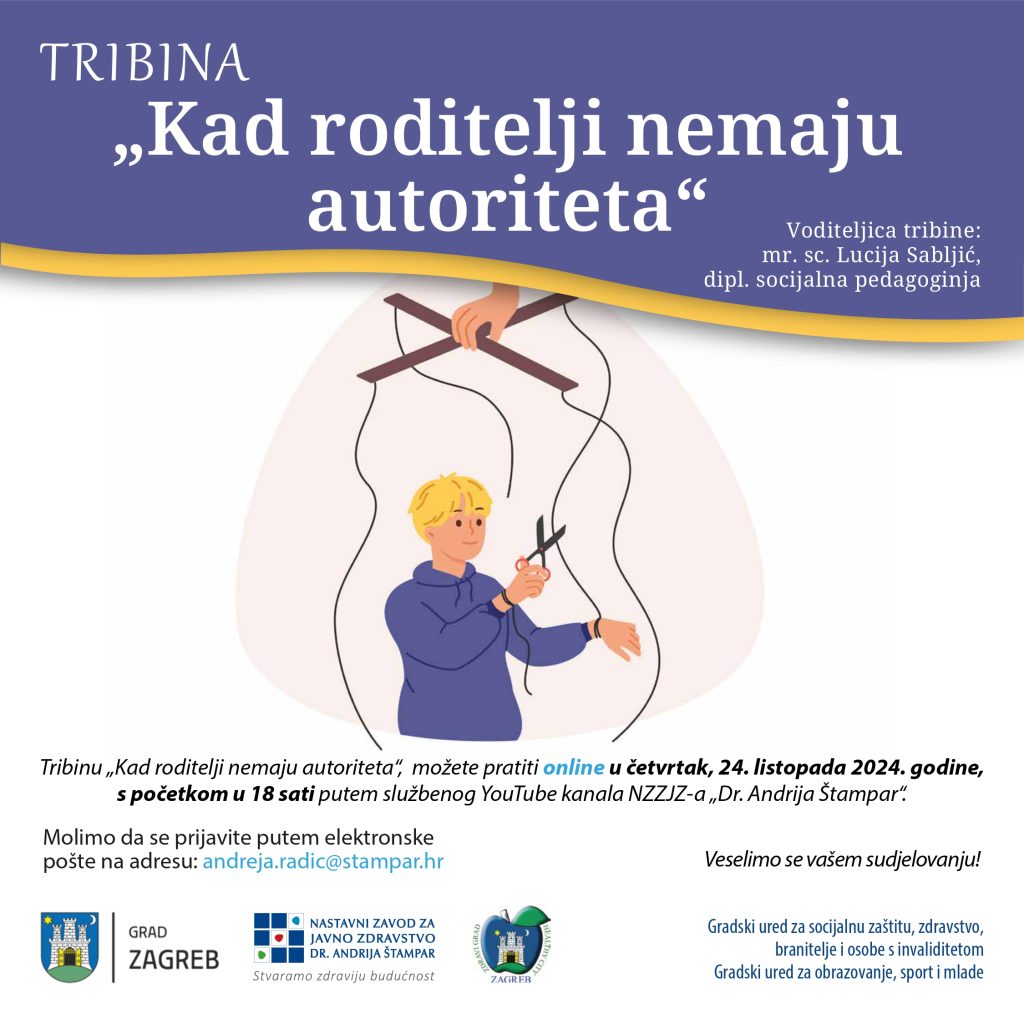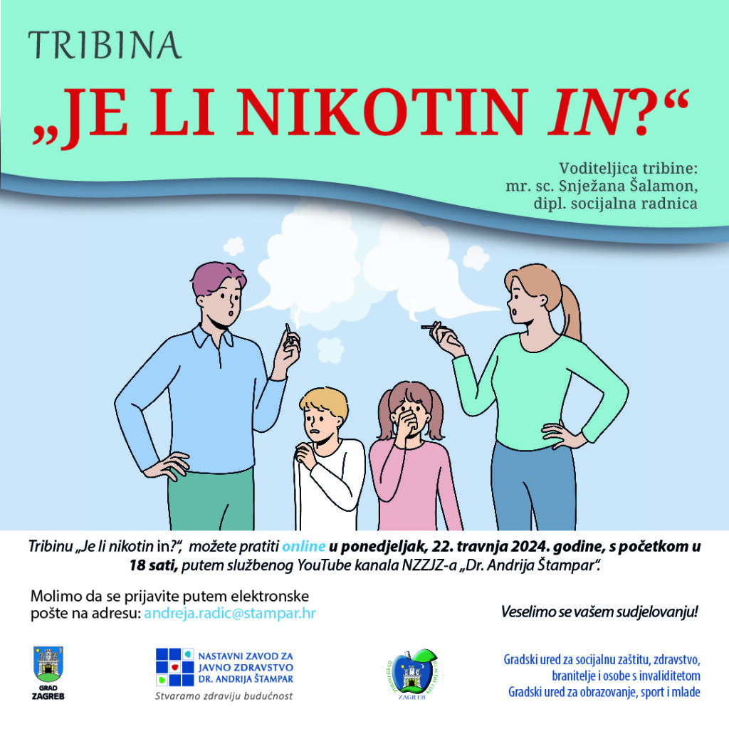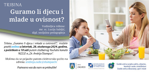 U Mjesecu obilježavanja borbe protiv ovisnosti, nova online tribina za roditelje: “Guramo li djecu i mlade u ovisnost?”, održat će se u četvrtak, 28. studenog 2024. godine, s početkom u 18 sati putem YouTube kanala. Vodit će je mr. sc. Lucija Sabljić, dipl. soc. pedagoginja iz Službe za mentalno zdravlje i prevenciju ovisnosti NZJZ „Dr. Andrija Štampar“.Prijava na adresu e-pošte: andreja.radic@stampar.hr. Snimka tribine dostupna Opširnije