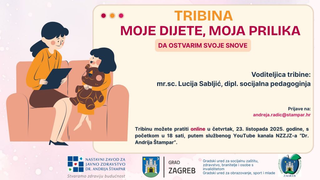 U sklopu obilježavanja Europskog tjedna mentalnog zdravlja, najava nove online tribine za roditelje “Postoje li danas hrabri roditelji?”, koja će se održati u utorak, 27. svibnja 2025. s početkom u 18 sati putem YouTube kanala. Vodit će je mr. sc. Snježana Šalamon, dipl. soc. radnica iz Službe za mentalno zdravlje i prevenciju ovisnosti NZJZ „Dr. Andrija Štampar“.Prijava na adresu e-pošte: andreja.radic@stampar.hr. Snimka tribine dostupna Opširnije
